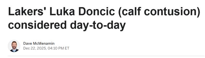 北京时间12月23日,湖人队球星东契奇确诊左小腿挫伤,球队主教练雷迪克表示,东契奇的伤情为每日观察状态。里夫斯和八村垒也是每日观察。